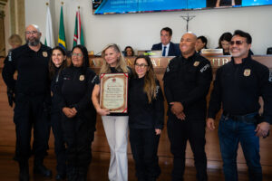 A vereadora Delegada Tathiana Guzella (União) homenageou o Grupo de Operações de Socorro Tático (GOST) com a honraria de Votos de Congratulações e Aplausos na