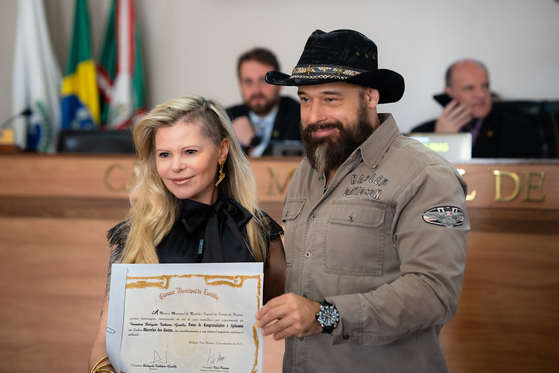 O musicista Marcelus dos Santos foi homenageado durante a sessão plenária da Câmara Municipal de Curitiba (CMC) na última quarta-feira (12). Autora da homenagem, a vereadora Delegada Tathiana Gisela (União) reconheceu a trajetória de Santos como referência do rock nacional, entregando a honraria de Votos de Congratulações e Aplausos ao profissional. Marcelus é empresário, diretor, produtor, vocalista e fundador da banda Motorocker.